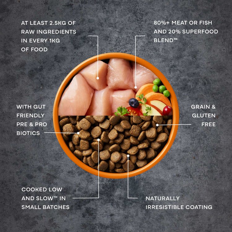 Chicken (66%), Dried Chicken (14%), Sweet Potato, Tapioca, Apple, Chickpeas, Peas, Minerals, Salmon Oil, Glucosamine 178mg/kg, Methylsulfonylmethane 178 mg/kg, Chondroitin 125 mg/kg, Lucerne, Cranberry, Pear, Blueberry, Mulberry, Orange, Bilberry, Cowberry, Carrot, Tomato, Chicory, Parsley, Peppermint, Spirulina, Seaweed, Oregano, Sage, Marjoram, Thyme, Chamomile, Rosehip, Stinging Nettle, Yucca, Marigold, Aniseed, Fenugreek, Cinnamon