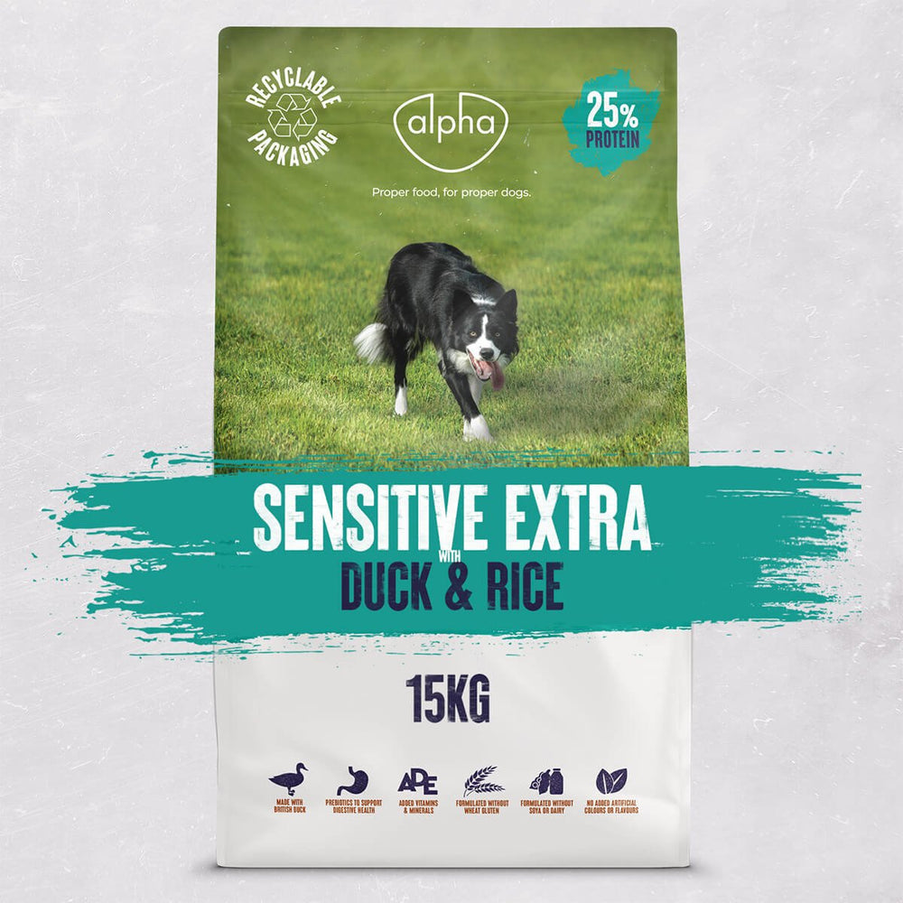Alpha Sensitive Extra 25% Protein Adult Dry Dog Food is made without wheat gluten and features Duck & Rice, tailored for adult dogs with dietary sensitivities. It includes prebiotics to support digestive health, linseed to promote healthy skin and coat, and is free from artificial colours and flavours. This complete feed is suitable for all breeds of adult working dogs with sensitive digestion.