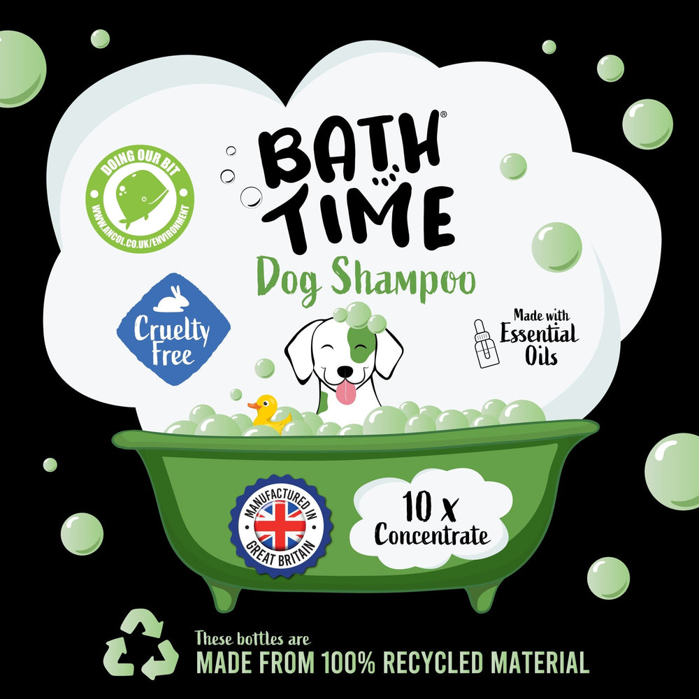 Ancol Bath Time Dog Shampoo with Baby Powder scent offers a gentle, skin-friendly formula suitable for dogs and puppies. It provides effective cleansing using natural essential oils. The 200 ml concentrate can deliver up to 20 washes per bottle. Proudly produced in the UK, the new shampoo bottles are made entirely from post-consumer recycled plastic, and both the bottle and cap are recyclable. This initiative aligns with Ancol's environmental sustainability plan.