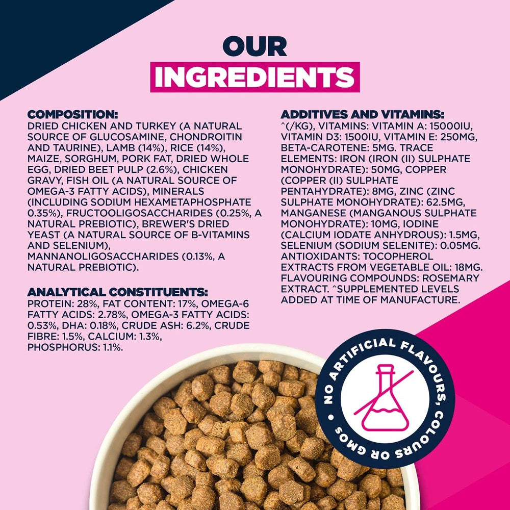 Dried chicken and turkey (a natural source of glucosamine, chondroitin and taurine), lamb (14%), rice (14%), maize, sorghum, pork fat, dried whole egg, dried beet pulp (2.6%), chicken gravy, fish oil (a natural source of omega-3 fatty acids), minerals (including sodium hexametaphosphate 0.35%), fructooligosaccharides (0.25%, a natural prebiotic), brewer's dried yeast (a natural source of B-vitamins and selenium), mannanoligosaccharides (0.13%, a natural prebiotic).