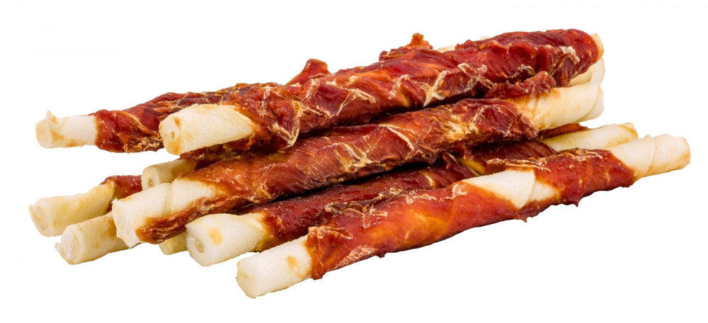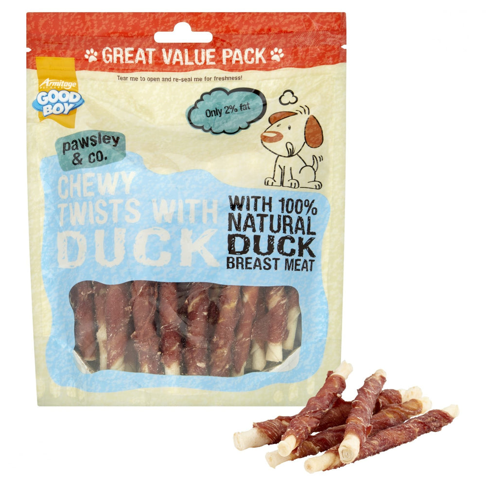 Good Boy Pawsley & Co Chewy Twists with Duck Dog Treats is crafted from 100% natural, human-grade roast duck breast meat. The chewy pieces are ideal for dogs who love to chew their treats, and they're super tasty too. These treats are gluten, wheat, and cereal-free, making them perfect for sensitive stomachs, and they contain no artificial nasties like colours, flavours, preservatives, or additives. They're lovingly packed in a handy, re-sealable bag, and as well as being delicious, they're full of natural goodness. The chewy texture of the rawhide also makes these tasty treats great for your dog’s dental health. It's simple: all dogs love to chew, and it’s a natural instinct. Chewing can provide your dog with stimulation and help reduce the risk of gum disease and tooth loss by keeping their jaws strong and teeth clean.