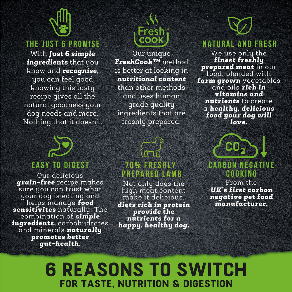 - 70% freshly prepared lamb blended with farm-grown vegetables and oils rich in vitamins and nutrients to create a healthy, delicious food your dog will love.