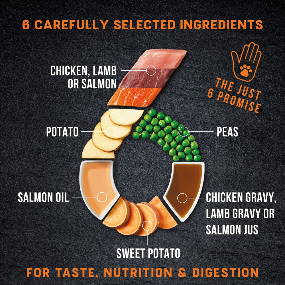 Harringtons Just 6 Complete Grain-Free Mixed Wet Dog Food Bumper Pack includes 16 trays of 380g each. Made with only six familiar ingredients, this tasty recipe provides all the natural goodness your dog needs and nothing unnecessary. Its high meat or fish content makes it both flavourful and nutritious, supporting a happy, healthy dog through a protein-rich diet. We select only the best ingredients to craft a healthy, delicious food your dog will enjoy. This grain-free recipe ensures you can trust what your dog is eating and helps naturally manage food sensitivities. The simple combination of ingredients, carbohydrates, and minerals promotes better gut health.