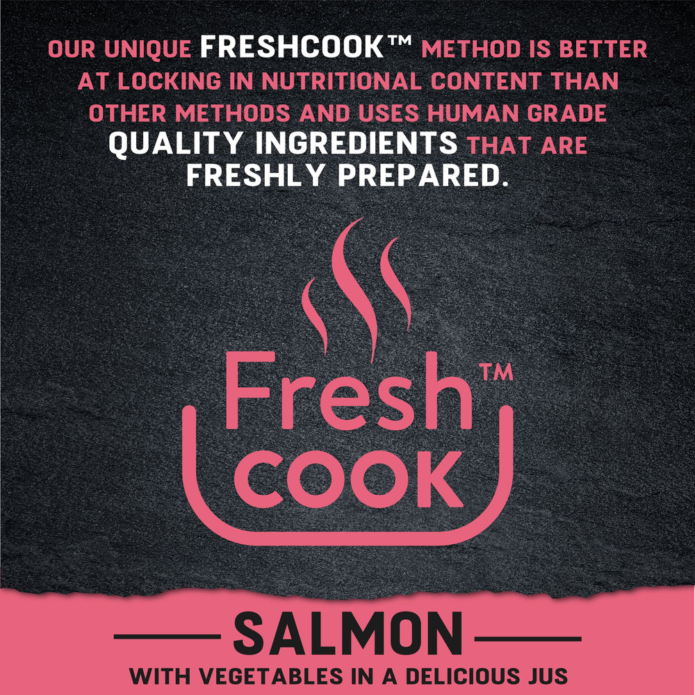 - 70% freshly prepared salmon blended with farm-grown vegetables and oils rich in vitamins and nutrients to create a healthy, delicious food your dog will love.