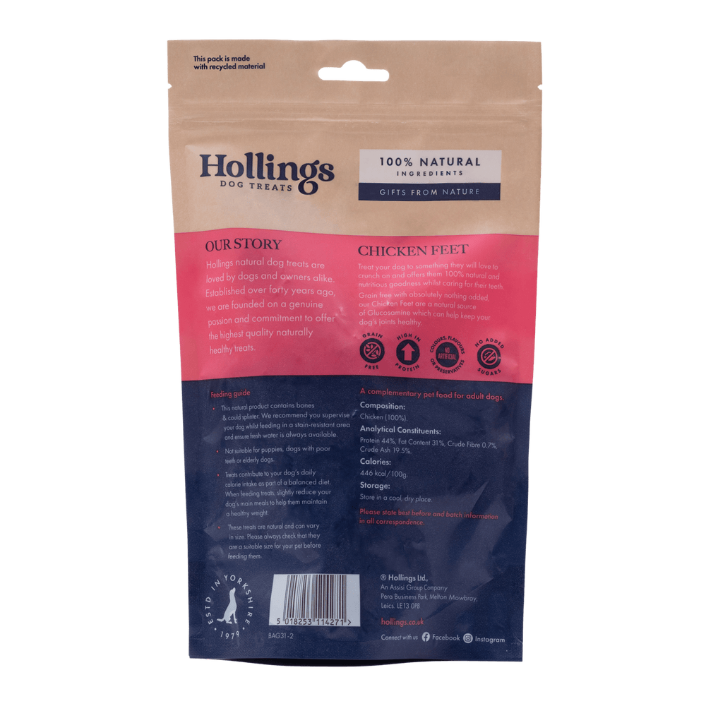 Hollings Chicken Feet Dog Treats are completely natural and tasty, inspired by the idea of minimising waste. Made from one of your dog's favourite proteins- chicken- these treats offer crunchy, nutritious goodness while supporting dental health. They are grain-free, with no artificial colours, flavours, or preservatives added, and naturally contain Glucosamine to promote joint health. These meaty treats are a great protein source and can be used as a natural reward or treat that dogs will enjoy crunching.