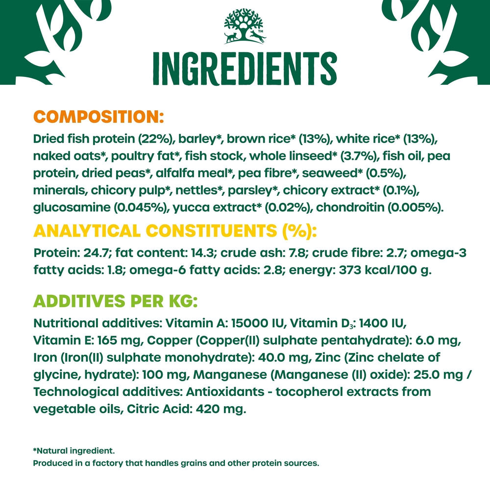Dried fish protein (22%), barley*, brown rice* (13%), white rice* (13%), naked oats*, poultry fat*, fish stock, whole linseed* (3.7%), fish oil, pea protein, dried peas*, alfalfa meal*, pea fibre*, seaweed* (0.5%), minerals, chicory pulp*, nettles*, parsley*, chicory extract* (0.1%), glucosamine (0.045%), yucca extract* (0.02%), chondroitin (0.005%). *Natural ingredient.