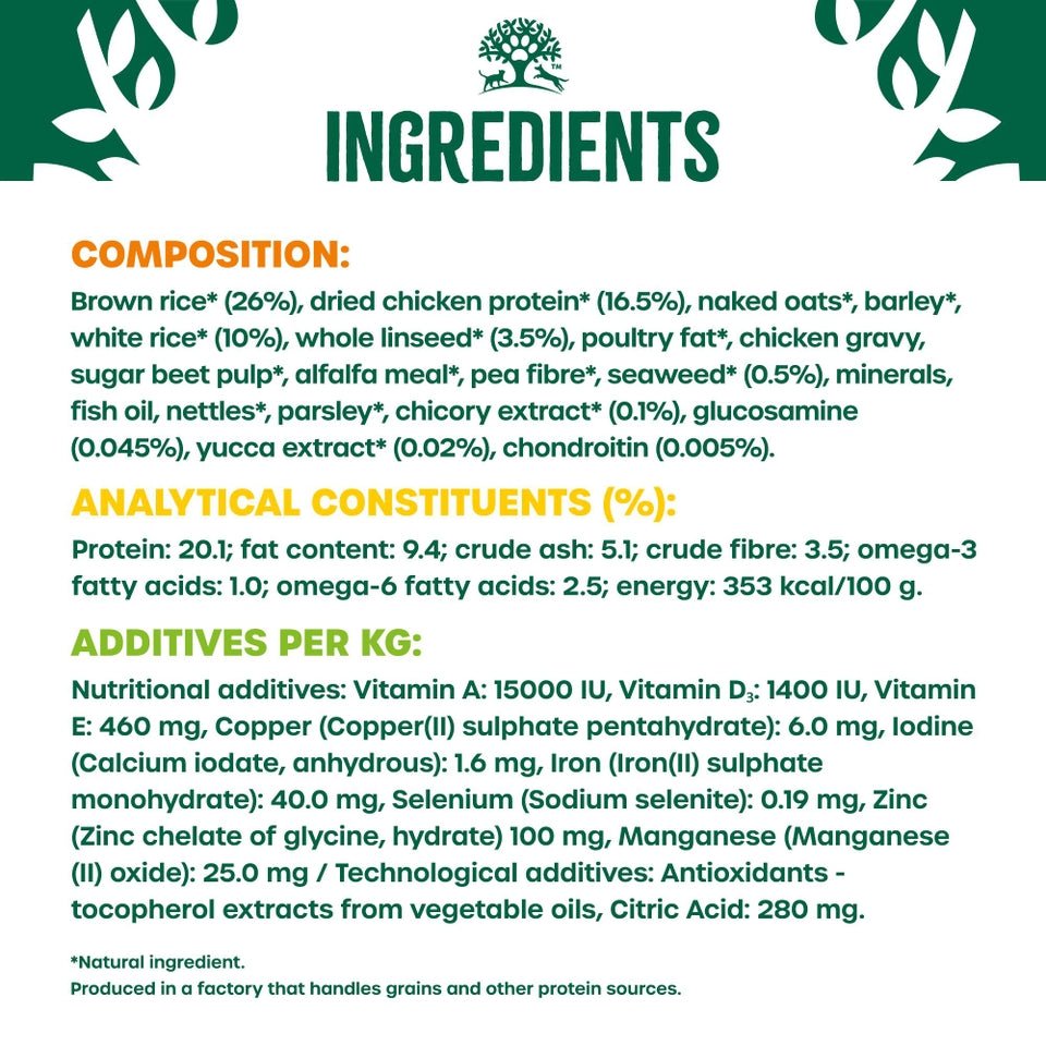 Brown rice* (26%), dried chicken protein* (16.5%), naked oats*, barley*, white rice* (10%), whole linseed* (3.5%), poultry fat*, chicken gravy, sugar beet pulp*, alfalfa meal*, pea fibre*, seaweed* (0.5%), minerals, fish oil, nettles*, parsley*, chicory extract* (0.1%), glucosamine (0.045%), yucca extract* (0.02%), chondroitin (0.005%). *Natural ingredient.