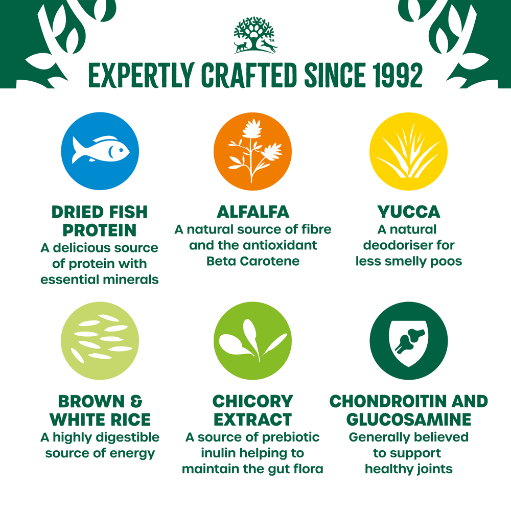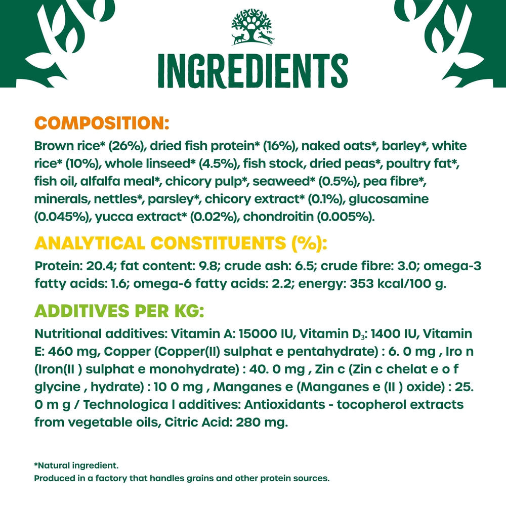 Brown rice* (26%), dried fish protein* (16%), naked oats*, barley*, white rice* (10%), whole linseed* (4.5%), fish stock, dried peas*, poultry fat*, fish oil, alfalfa meal*, chicory pulp*, seaweed* (0.5%), pea fibre*, minerals, nettles*, parsley*, chicory extract* (0.1%), glucosamine (0.045%), yucca extract* (0.02%), chondroitin (0.005%). *Natural ingredient.