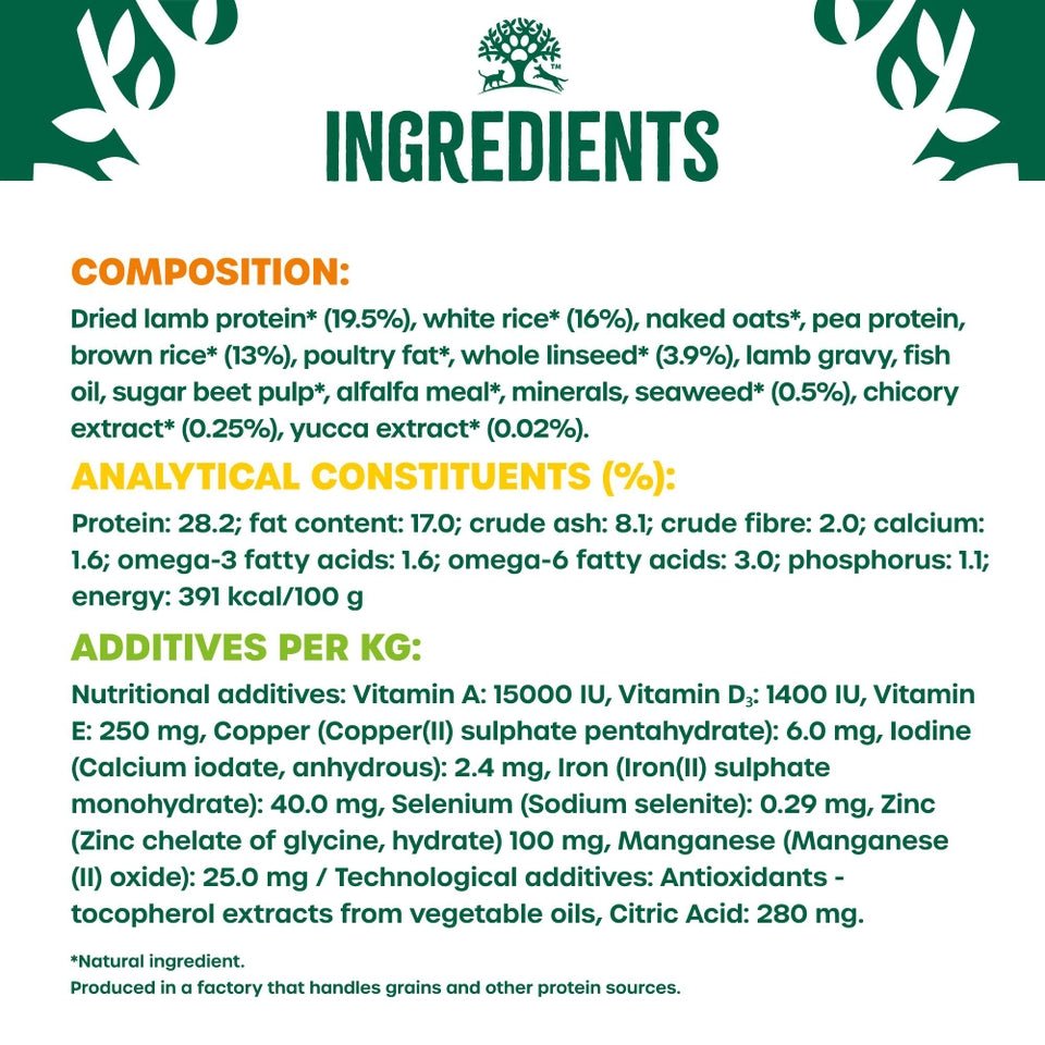 Dried lamb protein* (19.5%), white rice* (16%), naked oats*, pea protein, brown rice* (13%), poultry fat*, whole linseed* (3.9%), lamb gravy, fish oil, sugar beet pulp*, alfalfa meal*, minerals, seaweed* (0.5%), chicory extract* (0.25%), yucca extract* (0.02%). *Natural ingredient.