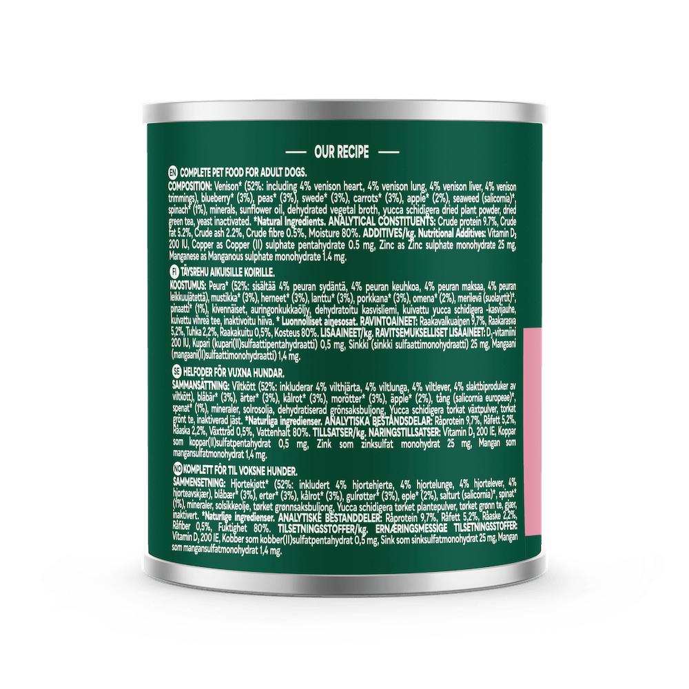Venison 52% (inc. 4% heart, 4% lung, 4% liver, 4% trimmings), Blueberry 3%, Peas 3%, Apples 2%, Swede 3%, Carrots 3%, Spinach 1%, Minerals, sunflower oil, dehydrated vegetal broth, green tea extract, yucca extract.
