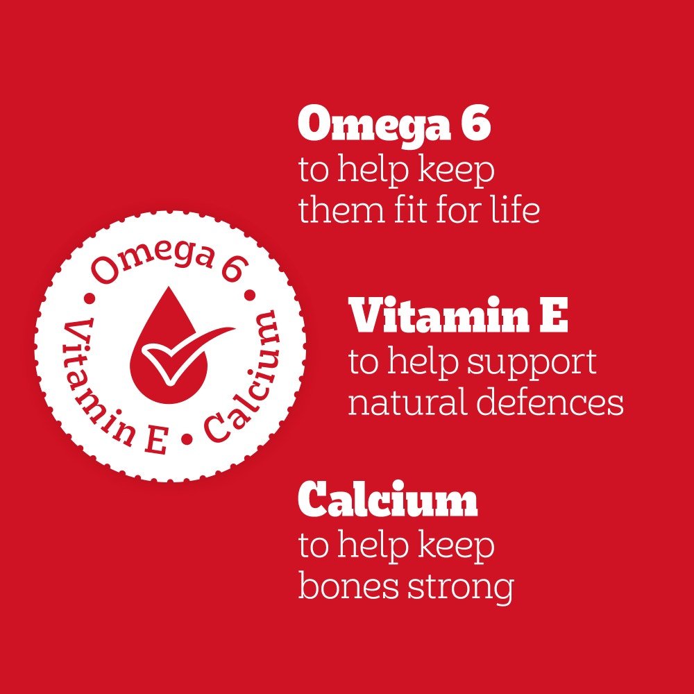 Chicken and Bacon Flavour Analytical constituents (%): Protein: 23.6, Fat content: 3.5, Inorganic matter: 5.9, Crude fibre: 2.1, Moisture: 18.2, Calcium: 0.8, Omega 3 fatty acids: 394 mg/kg, Energy: 297 kcal/100 g, Additives per kg:, Preservatives, Nutritional additives:, Vitamin A: 4930 IU, Vitamin E: 49.3 mg, Iron (Iron(II) sulphate monohydrate): 14.8 mg, Sensory additives:, Bacon flavour: 0.6 mg Beef and Poultry Flavour Analytical constituents (%): Protein: 7, Fat content: 2, Inorganic matter: 4.4, Crude fibre: 0.5, Moisture: 16, Calcium: 0.5, Omega 3 fatty acids: 615 mg/kg, Energy: 307 kcal/100 g, Additives per kg:, Preservatives, Nutritional additives:, Vitamin A: 5124 IU, Vitamin E: 51.2 mg, Iron (Iron(II) sulphate monohydrate): 15.4 mg