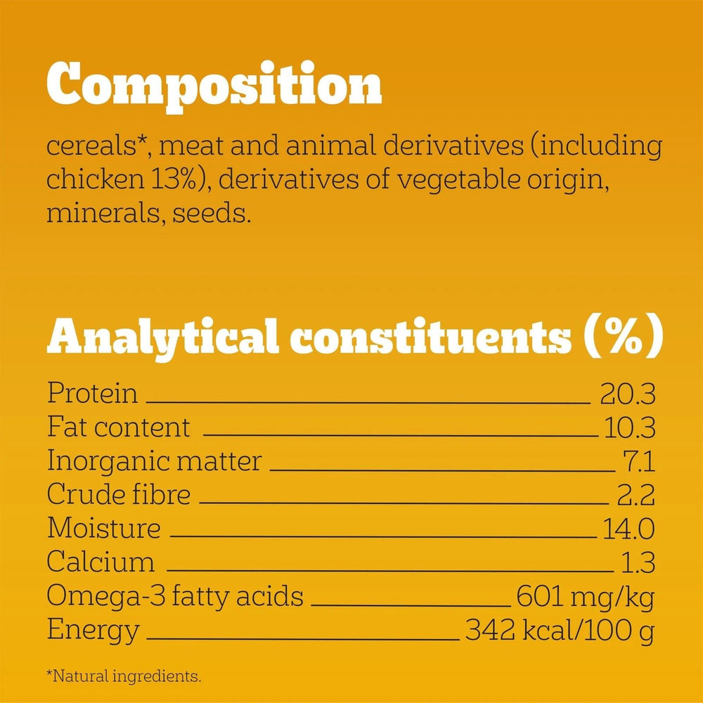 Cereals*, Meat and Animal Derivatives (including Chicken 13%), Derivatives of Vegetable origin, Minerals, Seeds, *Natural ingredients