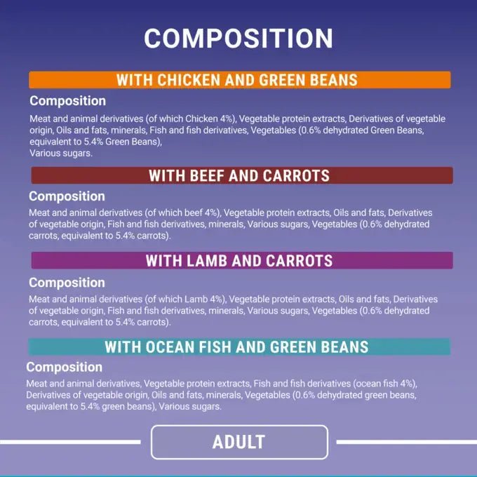 Meat and animal derivatives (of which chicken 4%), Vegetable protein extracts, Derivatives of vegetable origin, Oils and fats, Fish and fish derivatives, Minerals, Various sugars, Vegetables (0.6% dehydrated green beans; equivalent to 5.4% green beans).