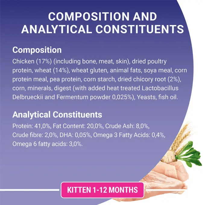 Chicken (including bone, meat, skin) (17%), Dried poultry protein, Wheat (14%), Wheat gluten, Animal fats, Soya meal, Corn protein meal, Pea protein, Corn starch, Dried chicory root (2%), Corn, Minerals, Digest (with added heat-treated Lactobacillus Delbrueckii and Fermentum powder 0.025%), Yeast, Fish oil.