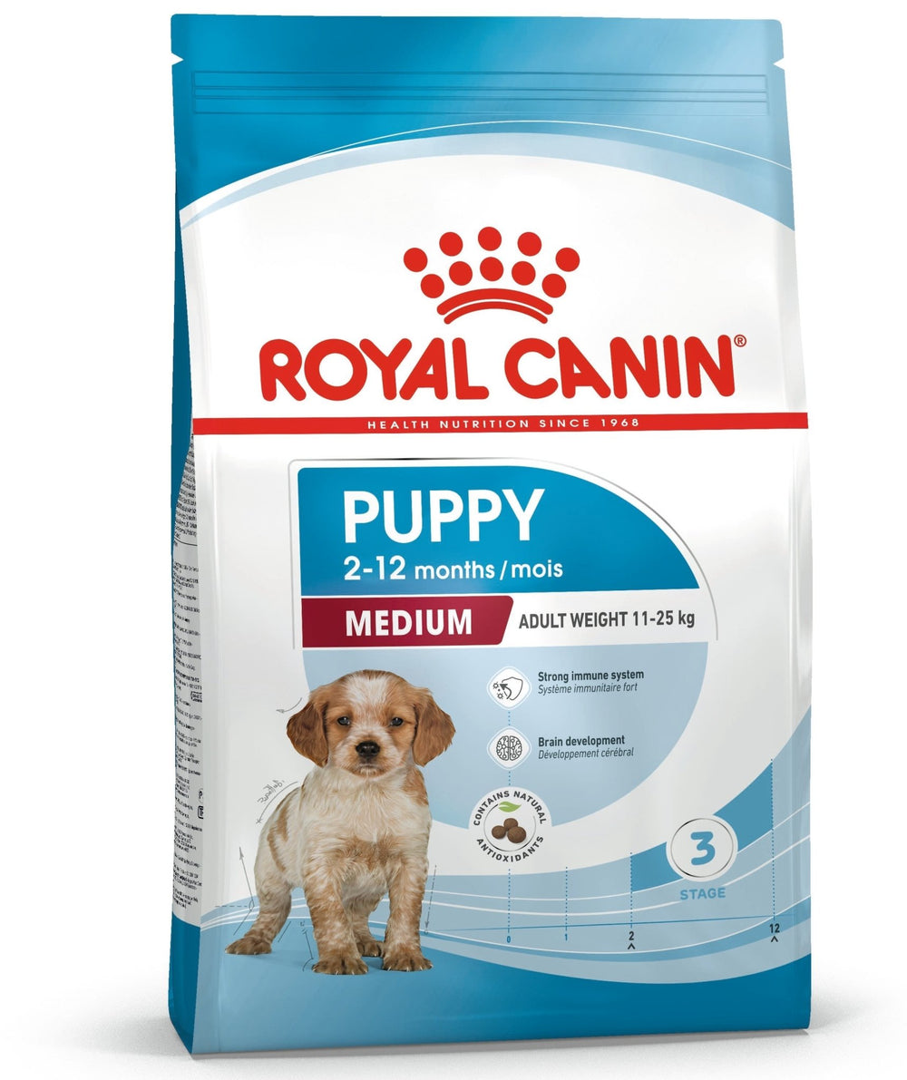 Royal Canin Medium Puppy Dry Food is designed for medium-sized puppies during their rapid growth phase, providing essential calories and nutrients for healthy development. This is a critical period when their bones, muscles, senses, and nervous system develop, and their immunity wanes as maternal antibodies diminish, making adequate protein intake vital for immune support. Formulated specifically for puppies aged 2 to 12 months that will reach 11-25kg as adults, this food includes nutrients like vitamins C and E to boost natural defences and omega-3 fatty acids (such as DHA) for brain development. It also contains prebiotics (FOS, MOS, beet pulp) and highly digestible proteins to promote a healthy gut microbiota and digestion. The energy content is tailored to meet the needs of growing medium-sized puppies. The kibble size is crafted for a medium puppy's mouth- large enough to prevent gobbling but not so big as to hinder eating- and supports dental health with a mechanical cleaning action during chewing. Feeding your puppy Royal Canin Medium Puppy ensures a complete and balanced diet.