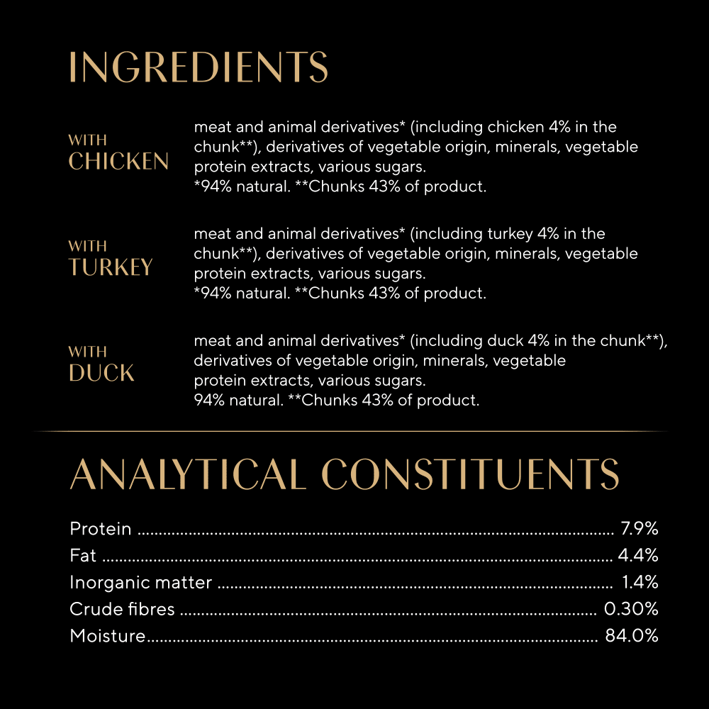 With Duck: Meat and Animal Derivatives* (including Duck 4% in the Chunk**), Derivatives of Vegetable Origin, Minerals, Vegetable Protein Extracts, Various Sugars. *94% Natural.