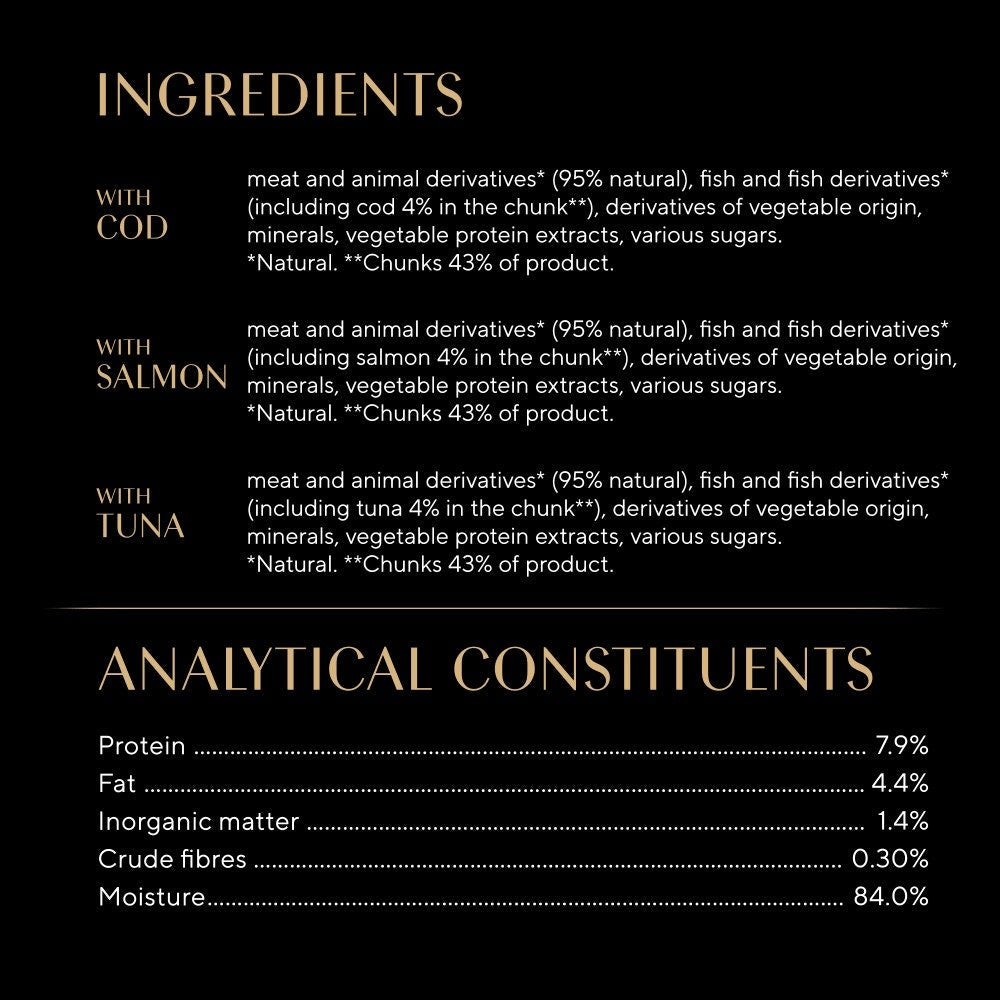Analytical constituents (%): Protein: 7.9, Fat content: 4.4, Inorganic matter: 1.4, Crude fibre: 0.30, Moisture: 84.0, Additives per kg:, Nutritional additives:, Vitamin D3: 200 IU (Vitamin D3 not supplemented in salmon and tuna varieties), Taurine: 573 mg, Copper (Copper(II) sulphate pentahydrate): 1.3 mg, iodine (Calcium iodate, anhydrous): 0.34 mg, Iron (Iron(II) sulphate monohydrate): 16.8 mg, Manganese (Manganous sulphate, monohydrate): 3.4 mg, Zinc (Zinc sulphate, monohydrate): 16.0 mg